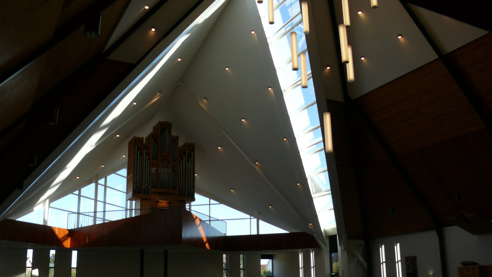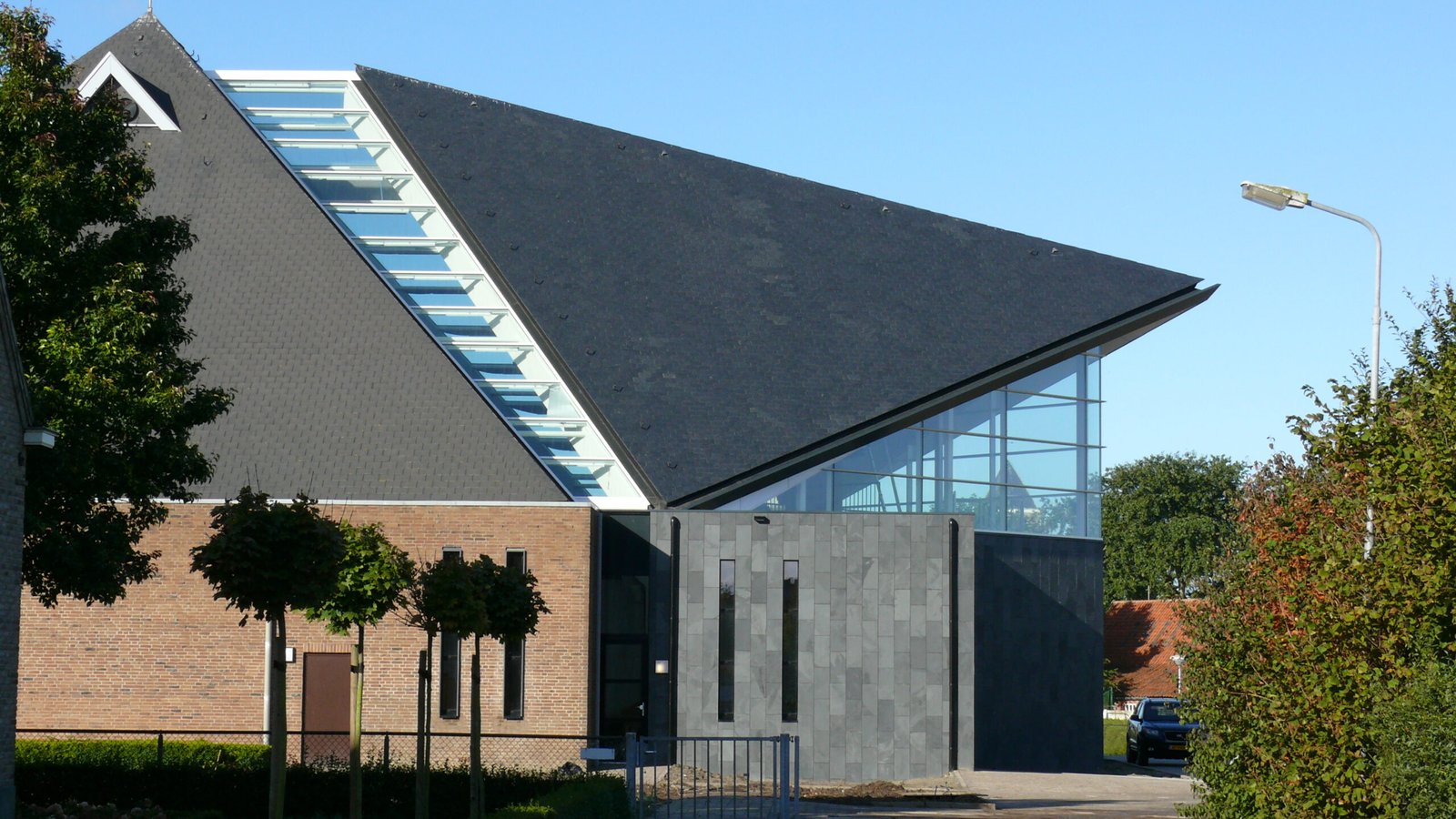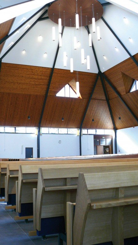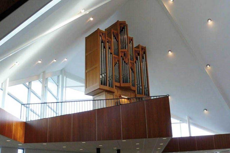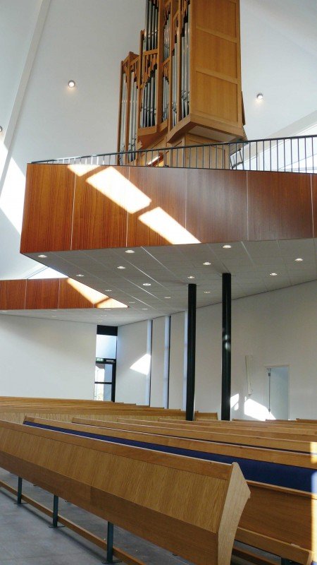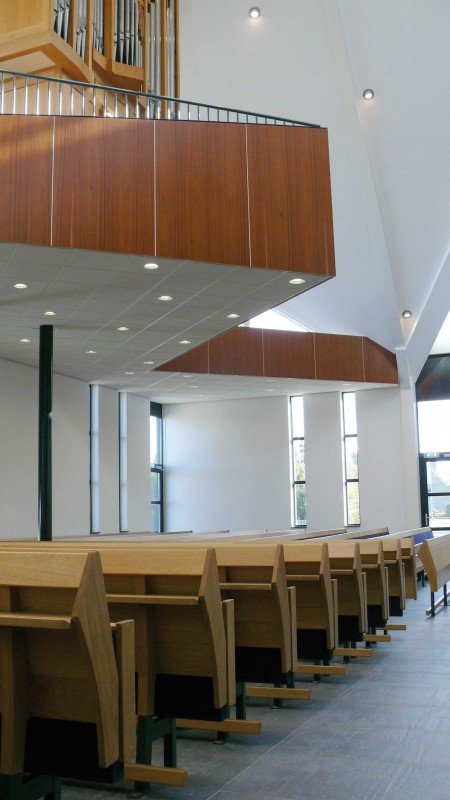 – ontferming onder de vleugel; uitbreiding met opklapbare zitplaatsen en orgelbalkon onder unieke lichtinval via de glaskap tussen het bestaande piramidedak en de nieuwe vleugel van natuurleien –